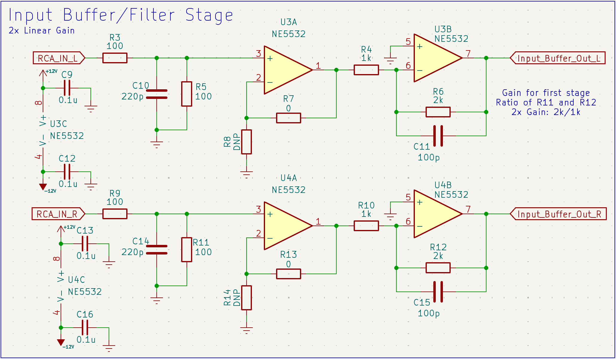 The amplifier accepts RCA line-level input and outputs through a 1/4" headphone jack. The signal path begins with a 2× gain input stage implemented with an op-amp, followed by a Baxandall volume control network that provides low-distortion analog attenuation. A dual op-amp output stage buffers and drives the headphone load. The circuit operates from a dual-rail ±15V supply derived from a 15V DC input with filtering and decoupling to reduce supply noise. The PCB was designed as a two-layer board with careful analog layout practices including star grounding, power decoupling near op-amps, and short signal paths to reduce noise and interference.